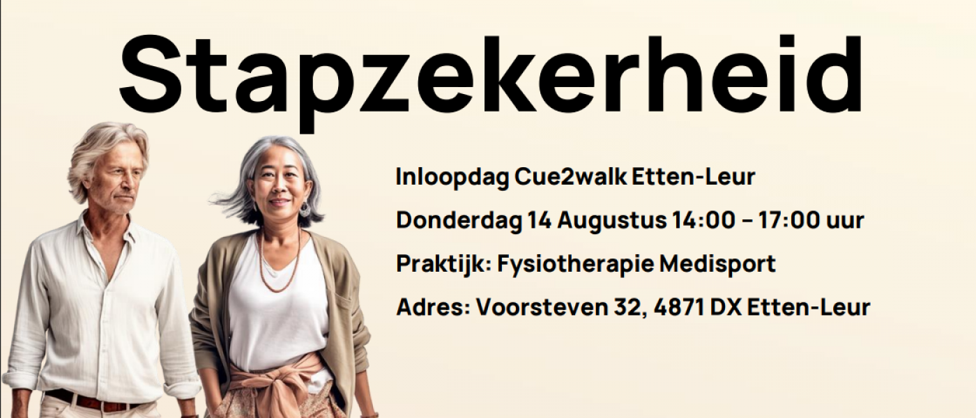 Donderdag 14 Augustus 14:00 – 17:00 uur bij Medisports Etten-Leur. Je kunt die dag de Cue2walk ervaren, meer informatie ontvangen en in een persoonlijk adviesgesprek bepalen of de Cue2walk geschikt is voor jou.