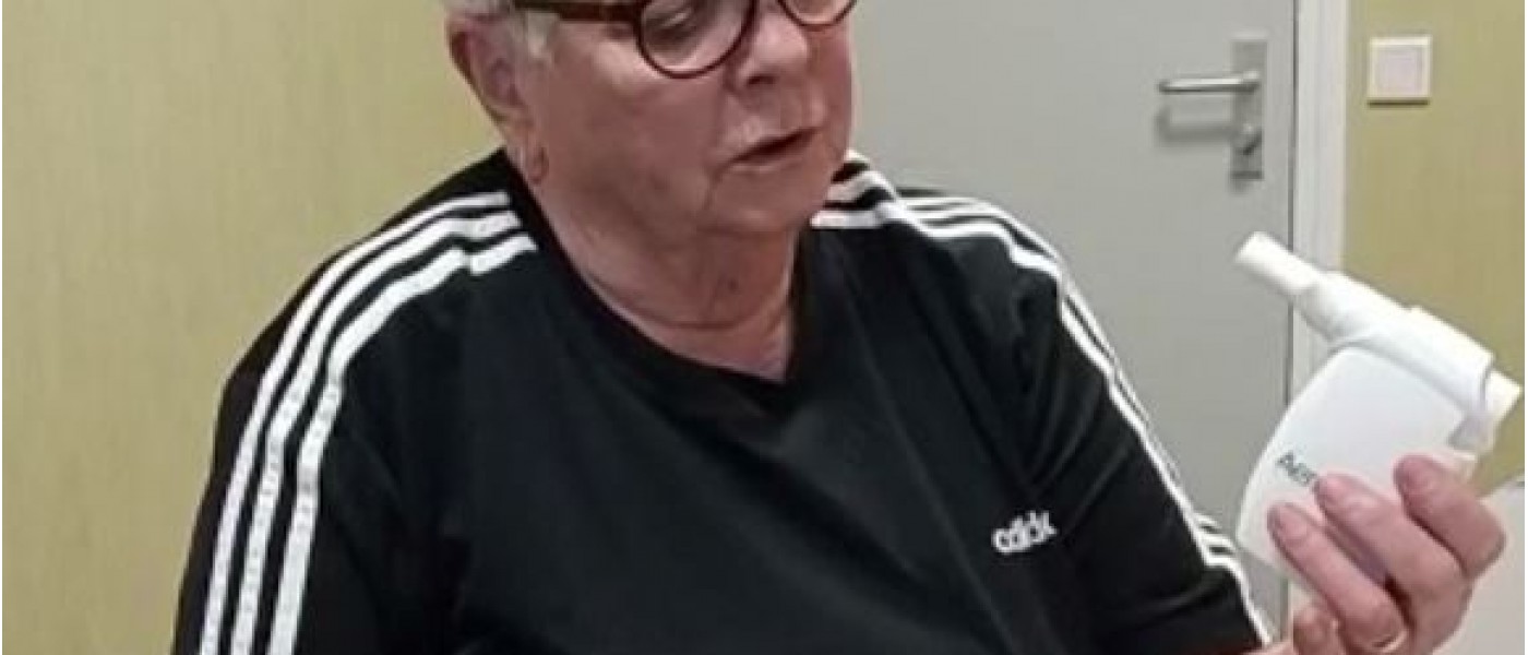 Fysiotherapeut Marc heeft het hulpmiddel de flutter aan patiënt Thea uitgelegd. Thea is COPD patiënt.
